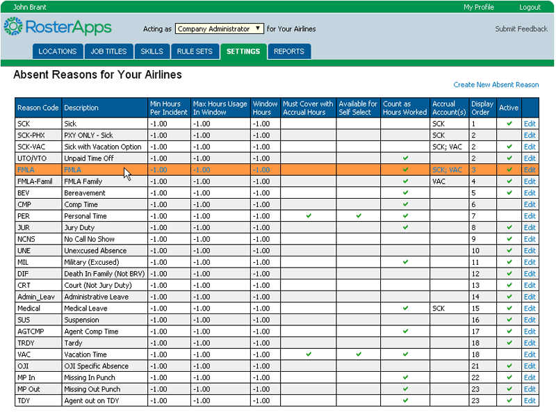You have complete control over the types of reasons available for selection when marking an employee absent. In addition, these absence reasons can be tied to accrual accounts to indicate that they are eligible for pay if the employee has enough hours in their accrual account to cover the absence. For example, the “Sick – Paid” absence reason might be tied to the “SICKHRS” accrual account but the plain “Sick” absence reason may not be. You can also indicate which reasons are available for the employees to self-select if you allow them to mark themselves absent.