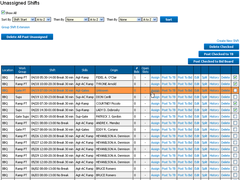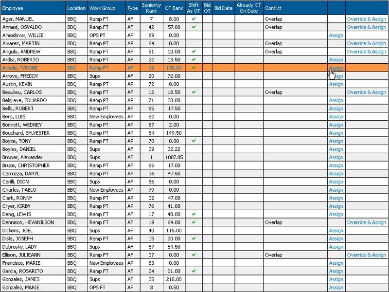 Individual shift assignments usually occur due to the need to fill open/overtime shifts caused by an un-planned increase in operational needs or the result of absences. You can also allow for employee self-scheduling by placing all the available shifts on a claim or bid board and allow employees to fill in their own schedules. Generally, individual shift assignments are made by direct assignment, placing the shifts on the trade board for claiming in first-come-first-serve manner, or placing the shifts on a bid board where employees can indicate their desire to work the shift and then the supervisor determines which employee will be assigned.