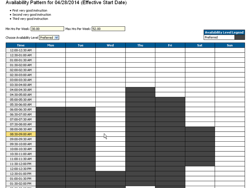 For those companies utilizing the Schedule Builder feature for assigning shifts, RosterApps provides a feature to allow employees and administrators to come to an agreement on their daily availability pattern. This pattern consists of the available time periods for each day of the week that the employee can be assigned to shifts. The minimum and maximum desired number of weekly hours can also be set.