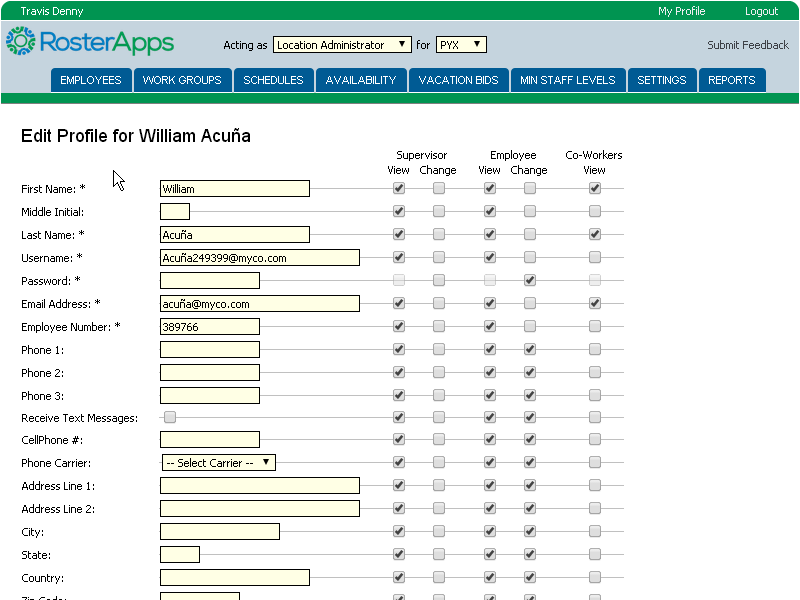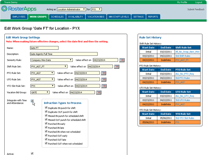 Location administrators can be thought of as the HR person at the location. They are mainly concerned with maintaining employee accounts and the running of shift bid packages and vacation bids. When acting on employee accounts they can transfer the person to another work group or location, edit the employee’s profile, view/edit the accrual account balances, edit the employee’s skill assignments, edit the rule assignments, adjust trade group rights, change employee status, and terminate employees.