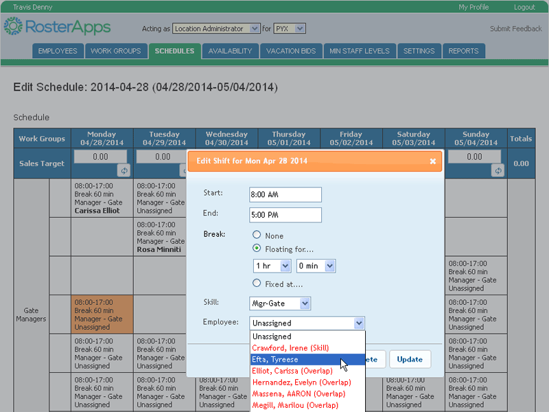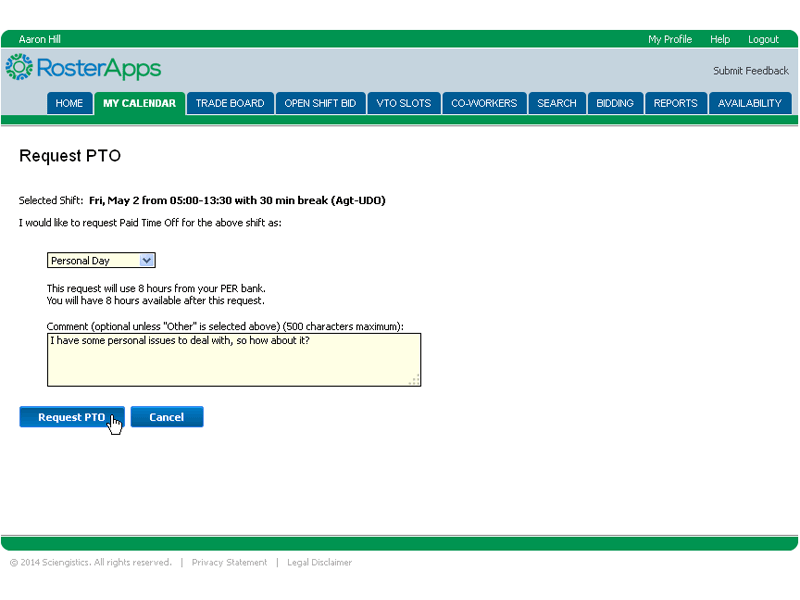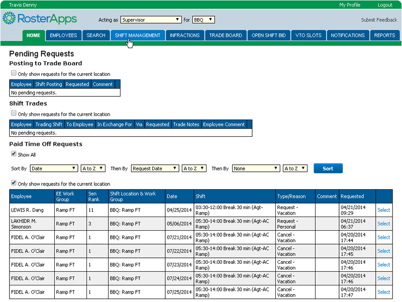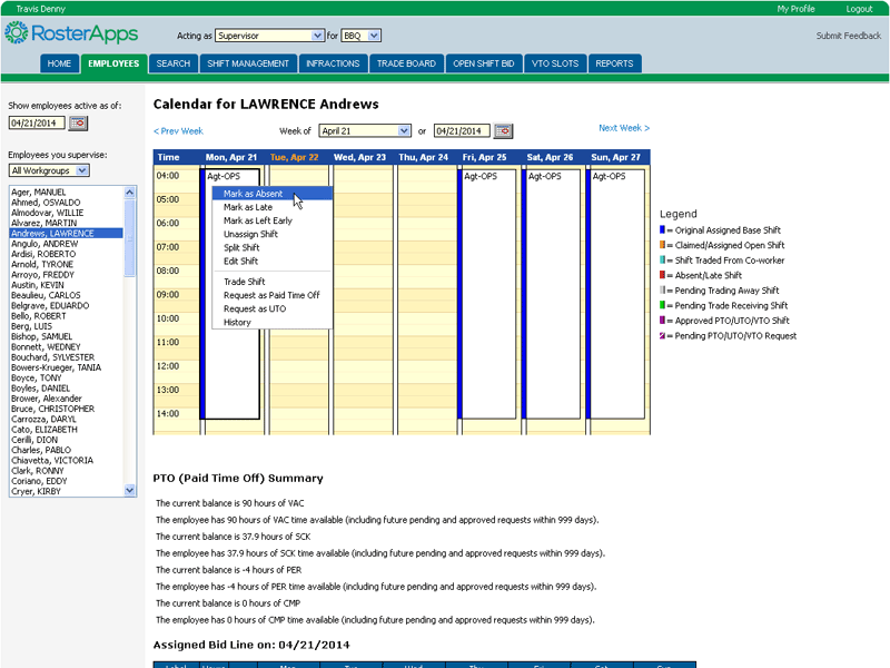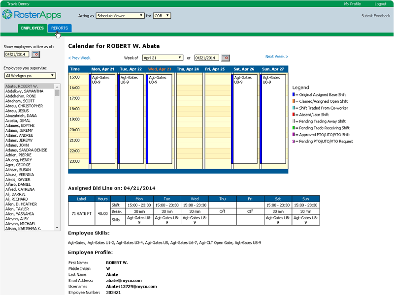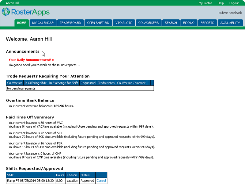 The employee role is the base role in RosterApps. Employee have schedules assigned to them and can take various actions upon those schedules (as allowed by the rules they operate under). Depending on how RosterApps is configured, an employee can bid on a work line, trade shifts, split shifts, request paid time off, request unpaid time off, view and select shifts from the trade board, bid on open shifts, claim voluntary time off slots, and run employee level reports.