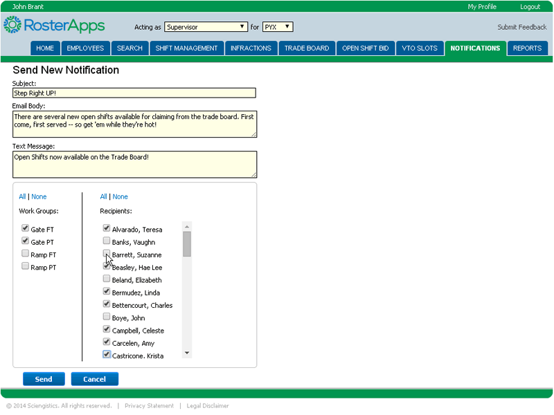 RosterApps has the ability to create an email (and optional text/SMS) message to be sent to selected or all employees for a location. This can be helpful when trying to fill last minute shifts or alerting off duty employees of operational issues they should be aware of.