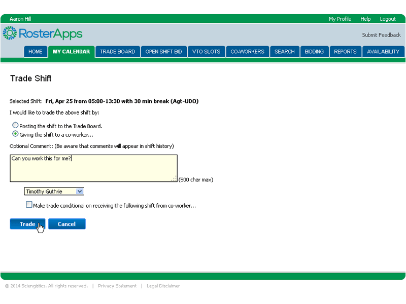 A one-way trade occurs when an employee wants to give up a shift and has a specific co-worker in mind to receive it. The employee assigned to the shift can initiate a request and the receiving employee must accept the request to complete the trade. Of course, if the trade would violate any of the rules in place, the request would be blocked before it could be submitted.