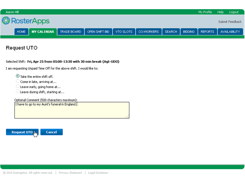 In some cases, the company might want to solicit volunteers to take off a shift, leave early, or come in late. Such a need might arise if business operations are expected to be less than originally planned. In this case, a supervisor can post a request to the Voluntary Time Off board and those employees that are willing to take the time off without pay and have qualified shifts can “claim” one of the available slots and receive automatic approval.
