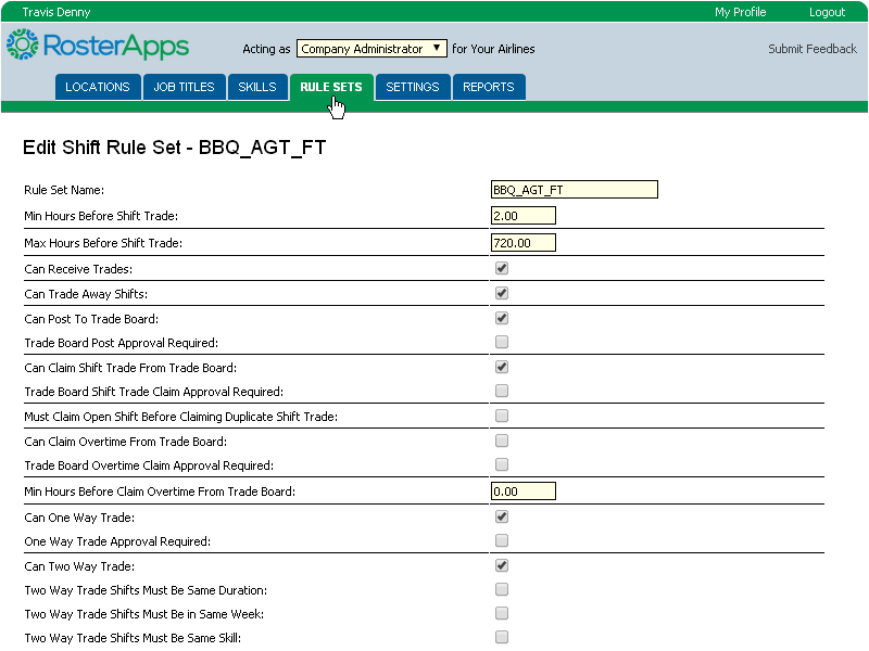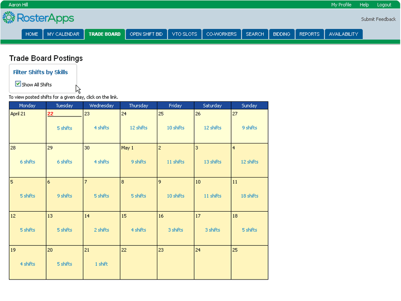 One of the most powerful self-service functions in RosterApps is the ability for employees to trade shifts among each other within the rules and constraints established by their employer. While the system can be configured to require supervisor approval for trades, most companies find that to be unnecessary since all checks and balances that the supervisor would review have already by checked by the system before the trade request was allowed to proceed. The ability to trade shifts empowers the employees to solve their own scheduling issues without involving management but still ensure that a qualified individual is covering the shift. The three main types of trades are those via the Trade Board, one-way trades, and two-way trades.
