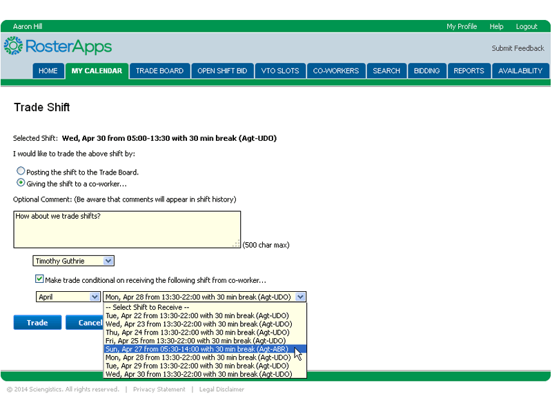 A two-way trade occurs when an employee wants to give up a shift to a specific co-worker and wants to receive one of the co-worker’s shifts in exchange. One of the two employees can initiate a request and the other employee must accept the request to complete the trade. Of course, if the trade would violate any of the rules in place, the request would be blocked before it could be submitted.